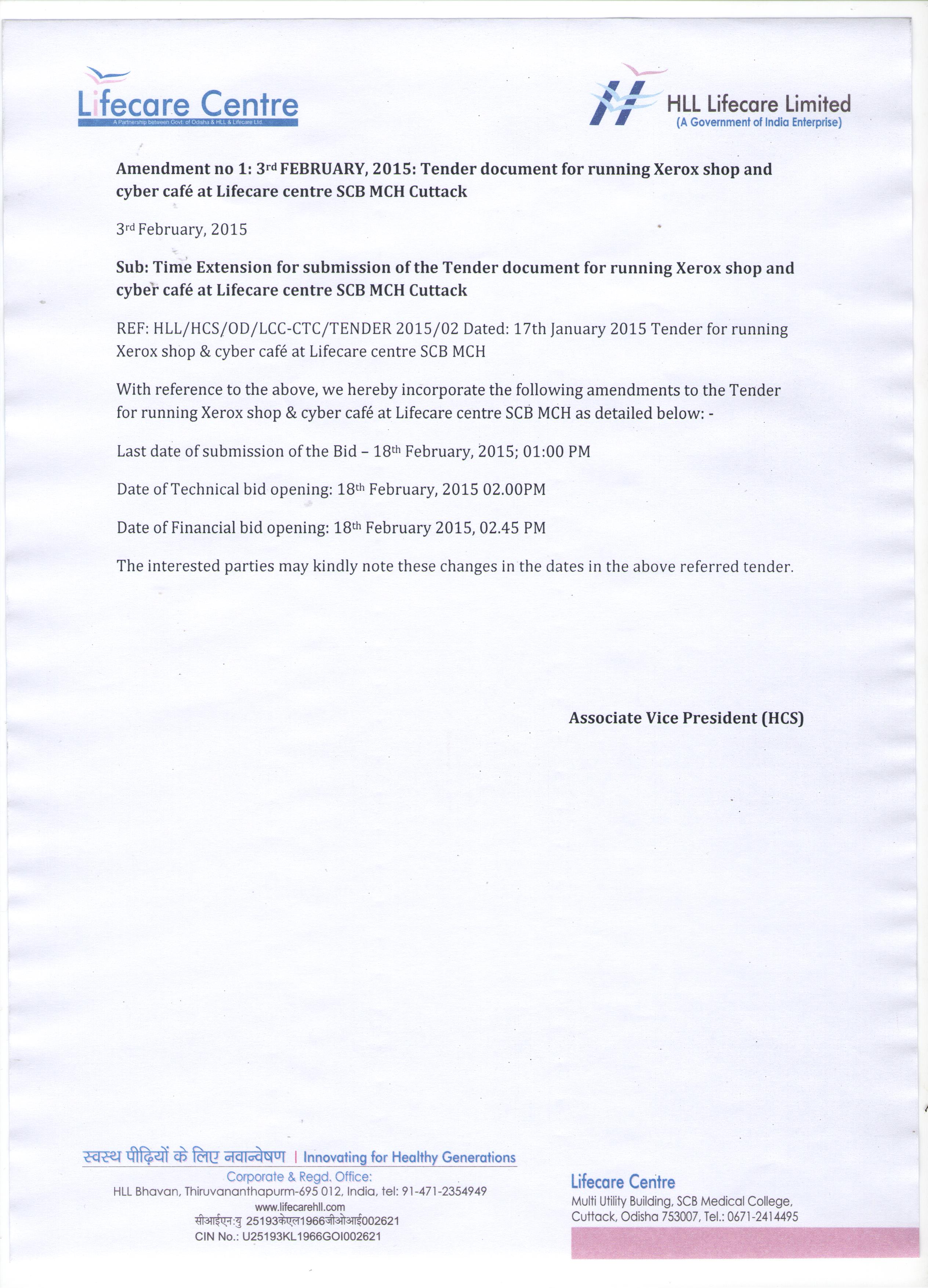 Amendment No-1 : Extention of Date : RUNNING CYBER CAFÉ & XEROX SHOP AT LIFECARE CENTRE S C B MEDICAL COLLEGE CUTTACK, ODISHA